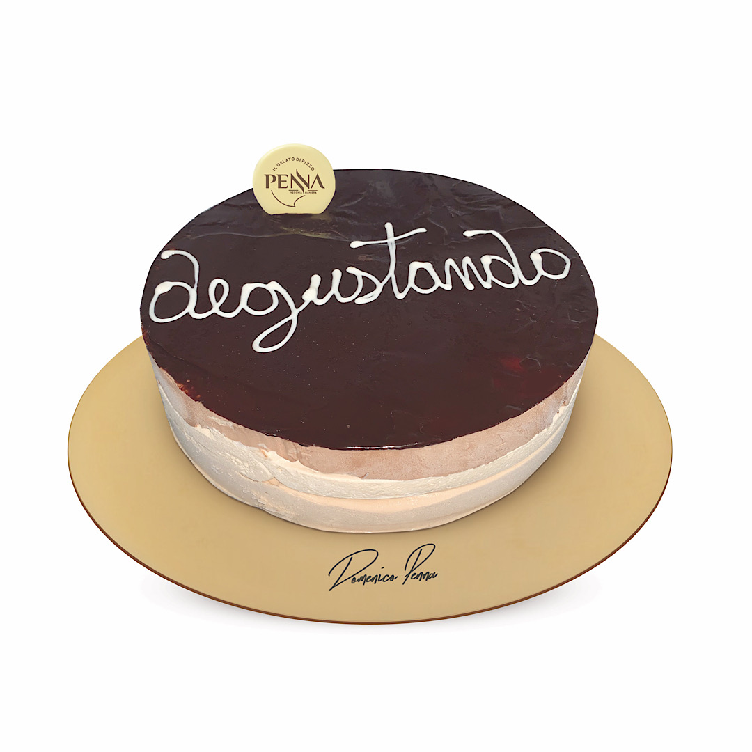 Gelato nocciola, gelato nutella, semifreddo nocciola, biscottino croccante, pan di spagna al cioccolato e copertura di glassa al cioccolato fondente.